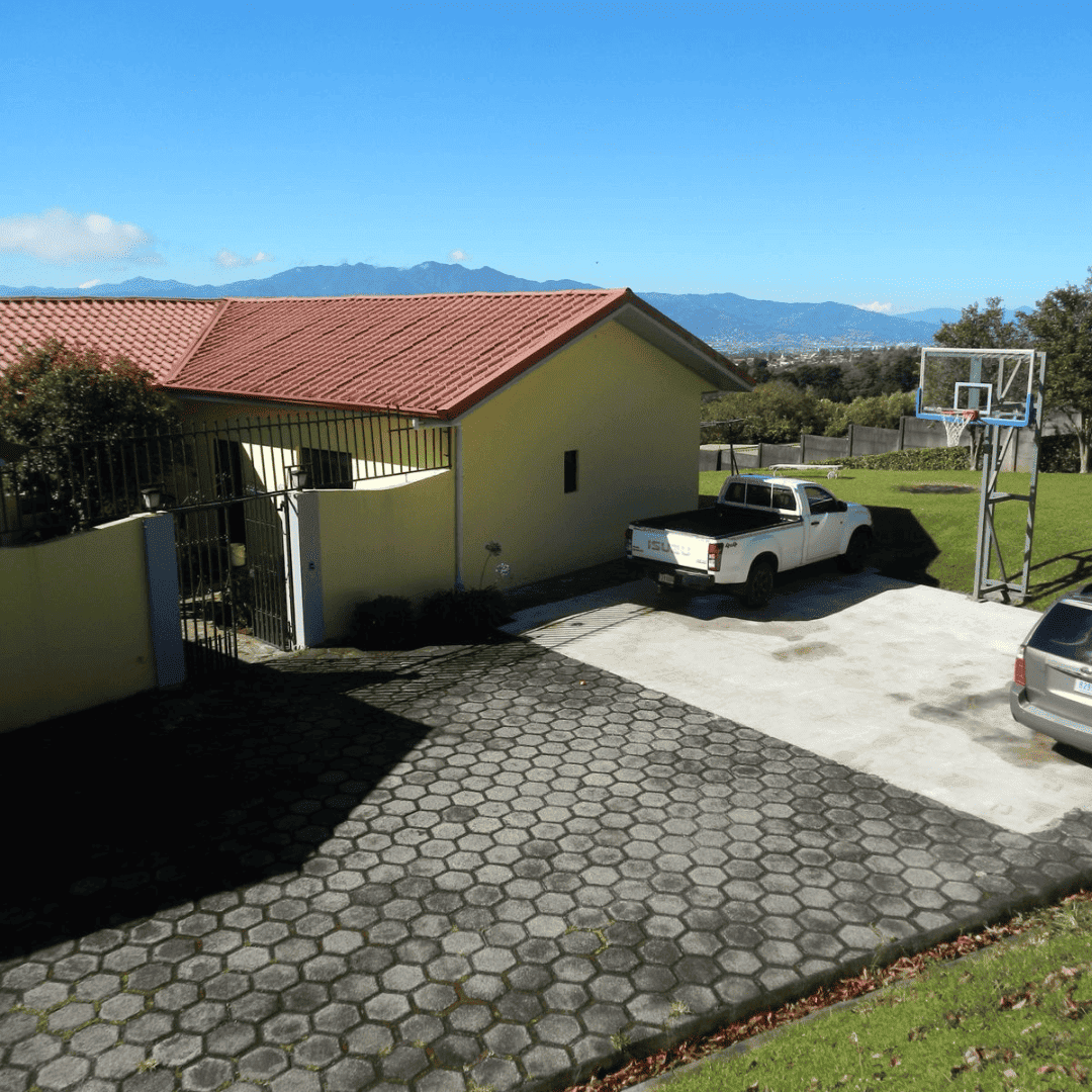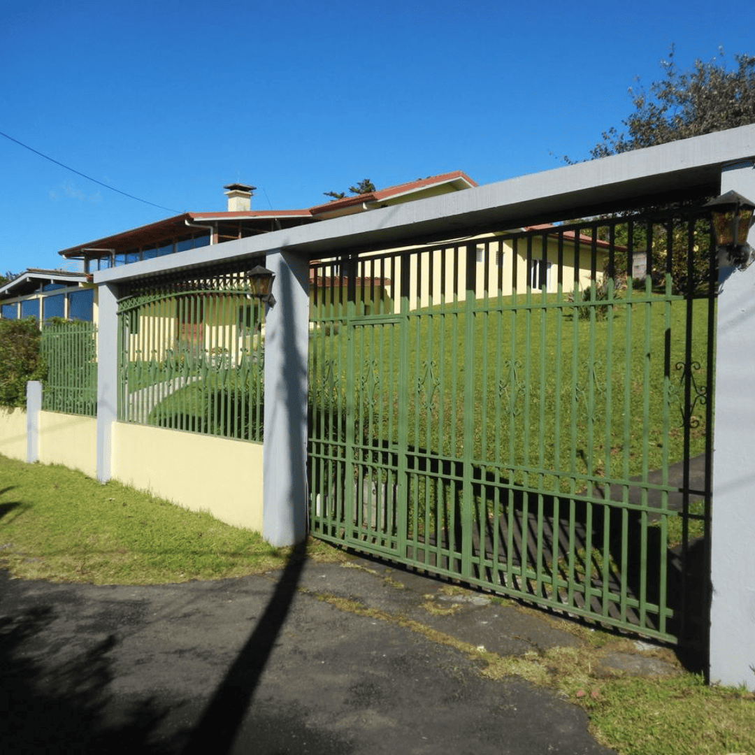 Features include a fully enclosed lot with walls, high fences, and an electric gate, providing a secure and private environment. The property offers gardens, mature trees, and mountain views, while remaining conveniently connected to urban centers such as Heredia and San José.